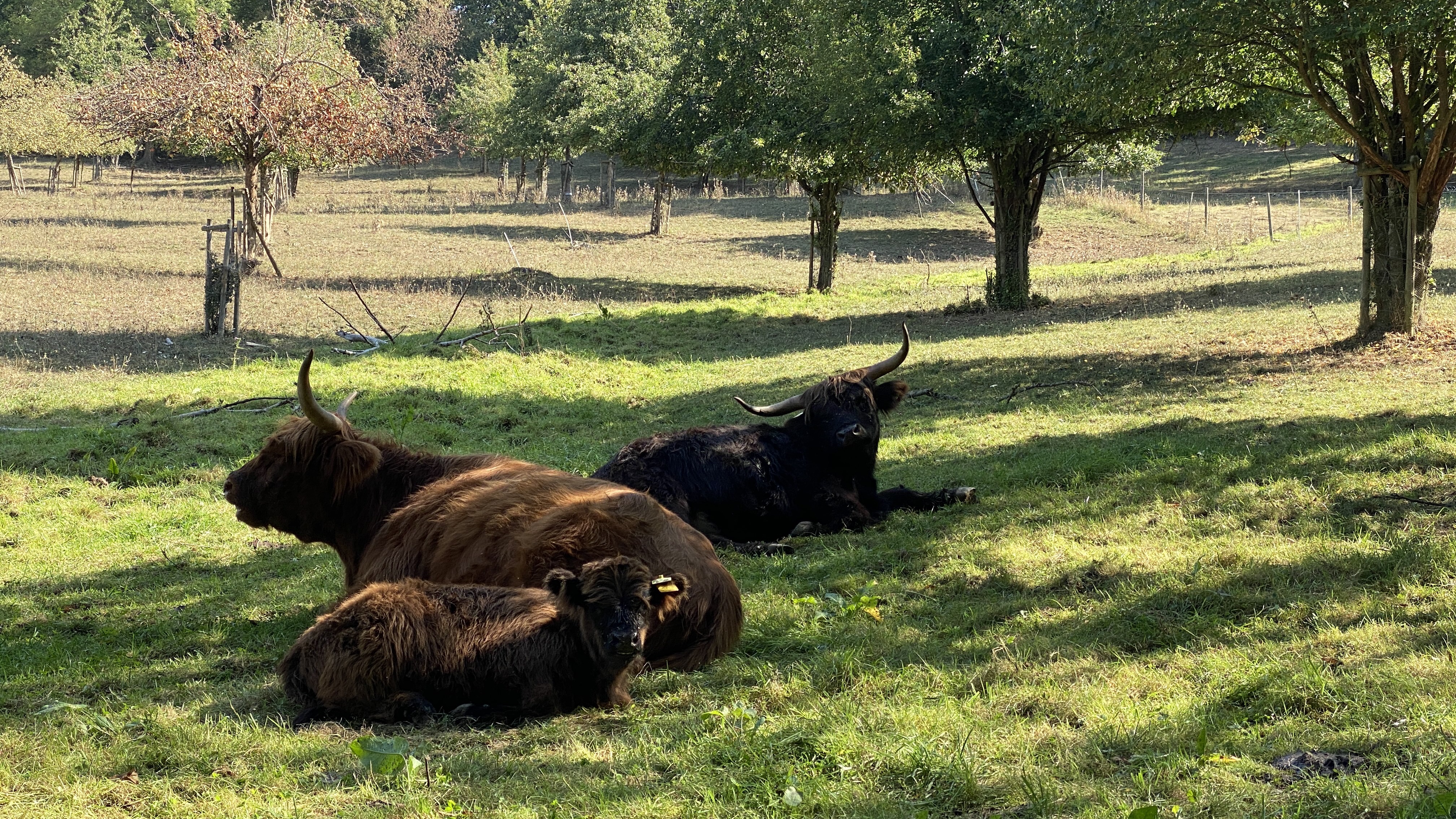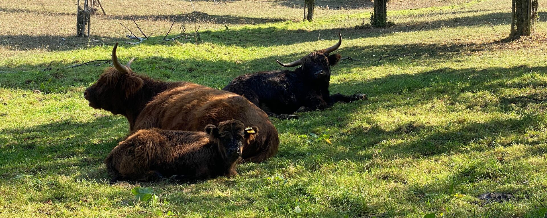 Auf der Wiese ruhen mehrere Schottische Hochlandrinder, eine robuste Rinderrasse mit langem Fell und markanten Hörnern.