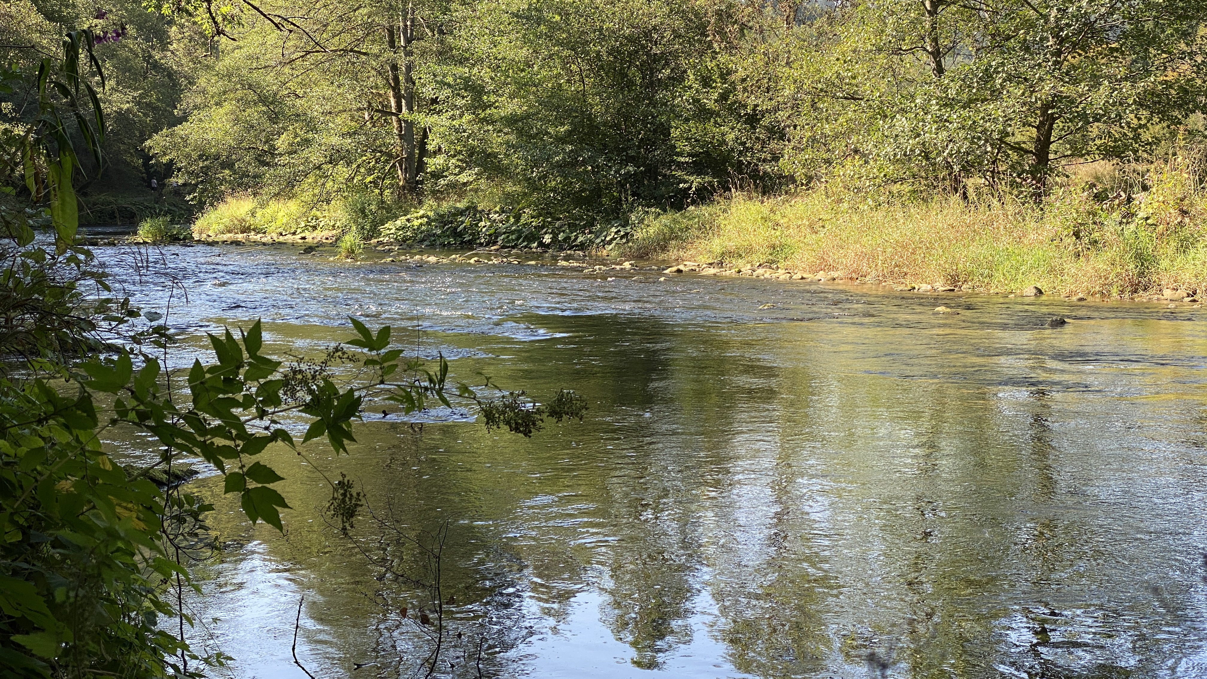 Die Kyll fließt bei Phillippsheim ruhig durch das Tal und prägt mit ihren Wiesen und Ufern die idyllische Landschaft der Südeifel.