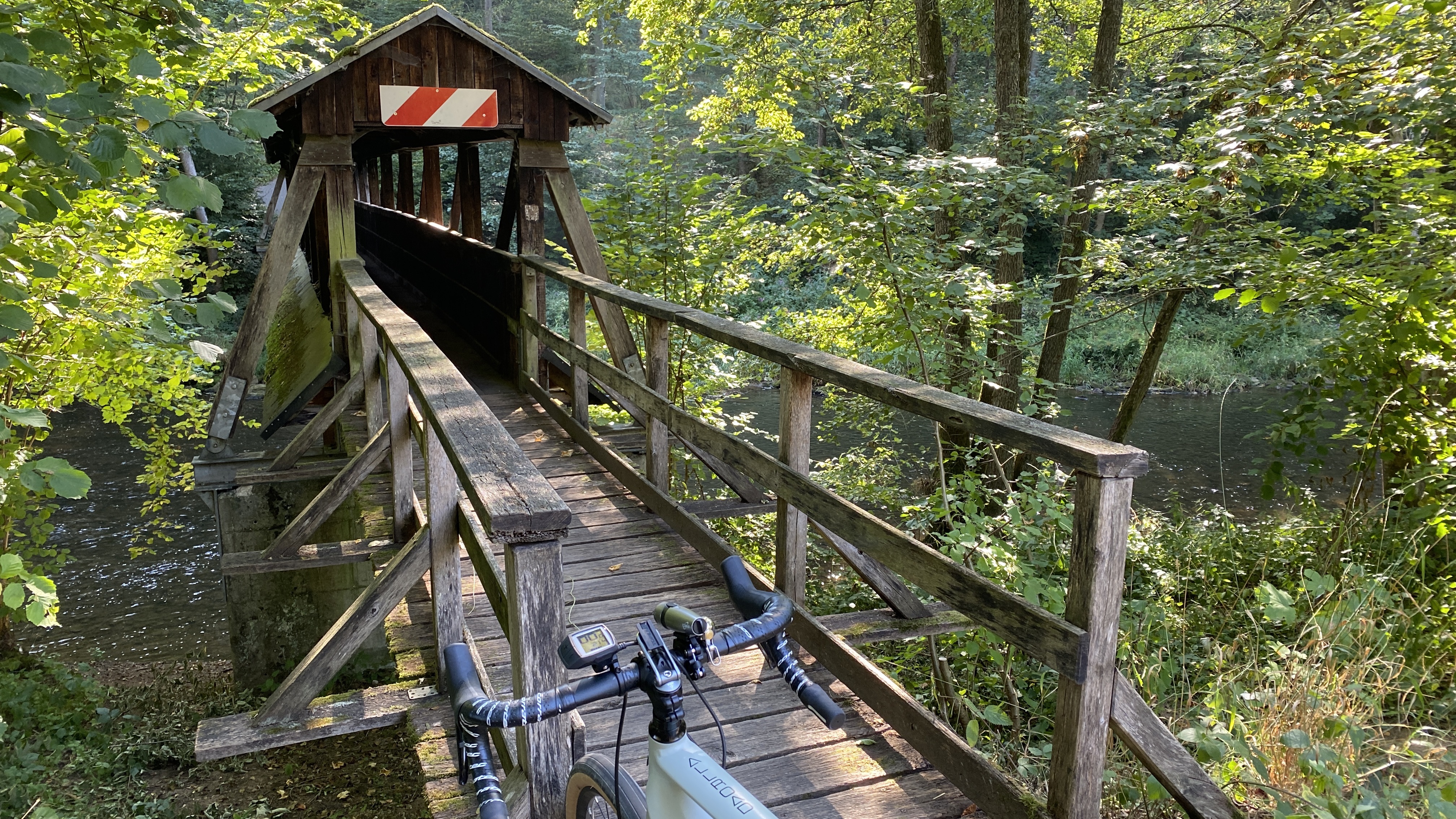 Diese hölzerne Rad- und Fußgängerbrücke wurde bei der Flut 2021 zerstört, aber inzwischen wurde an gleicher Stelle eine neue Rad- und Wanderbrücke gebaut.